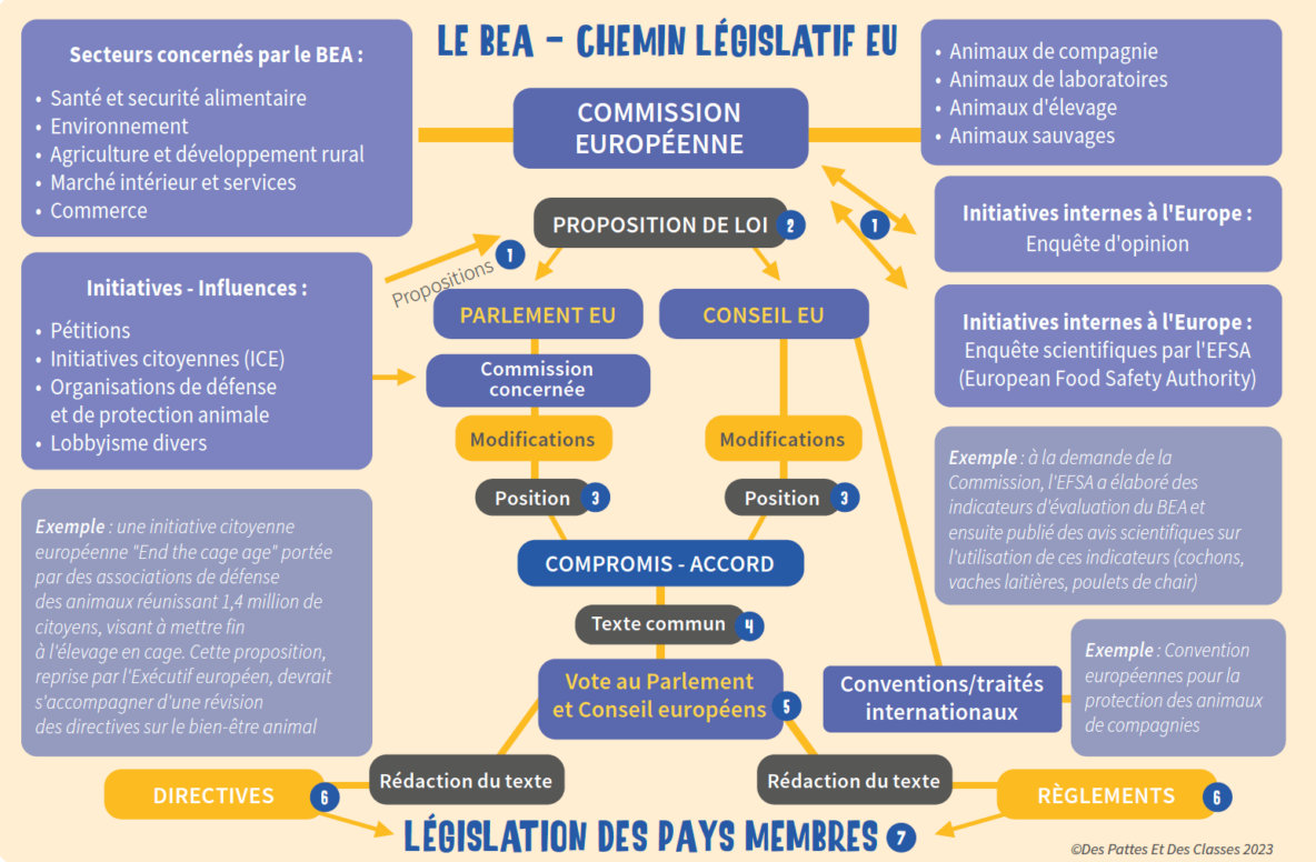 Les Etats membres ont délégué une partie de leurs compétences aux institutions européennes. Ils fonctionnent sur le principe des compétences partagées entre l’UE et les Etats membres en termes de bien-être animal. L’Europe vote des règlements et des directives qui doivent alors se retrouver dans les législations nationales, fédérales, régionales ou locales selon la structure du pays membre concerné. On vous …